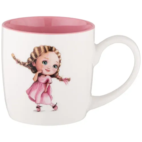 Кружка выполнена из фарфора, что обеспечивает прочность и гигиеничность. Поверхность украшена декоративным изображением девочки, нанесённым на глазурованное покрытие. Удобная ручка облегчает использование.