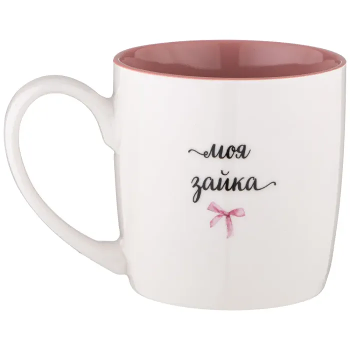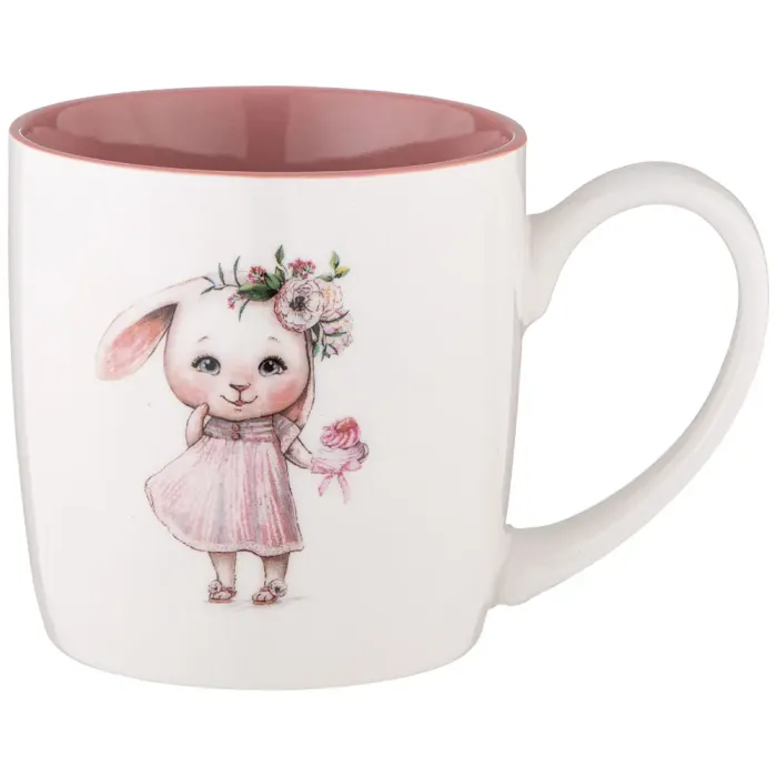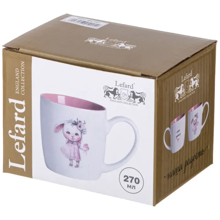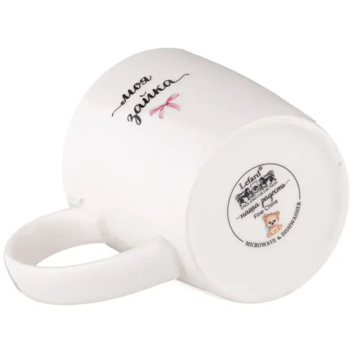 Кружка выполнена из высококачественного фарфора, который обладает устойчивостью к сколам и трещинам. На внешней стороне нанесено декоративное изображение зайки.