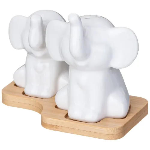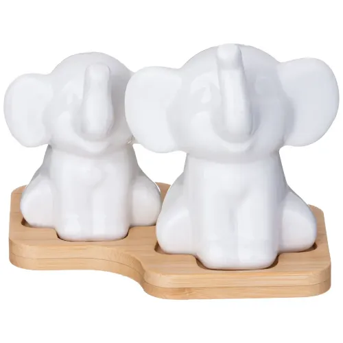 - Материал: Durable Porcelain (фарфор), бамбук- Количество предметов в наборе: 3 (2 фарфоровые фигурки, 1 подставка)- Форма: фигурки слонов- Совместимость: фарфоровые элементы — микроволновая печь, посудомоечная машина- Особенности ухода: элементы из бамбука требуют ручной мойки с нейтральными средствами