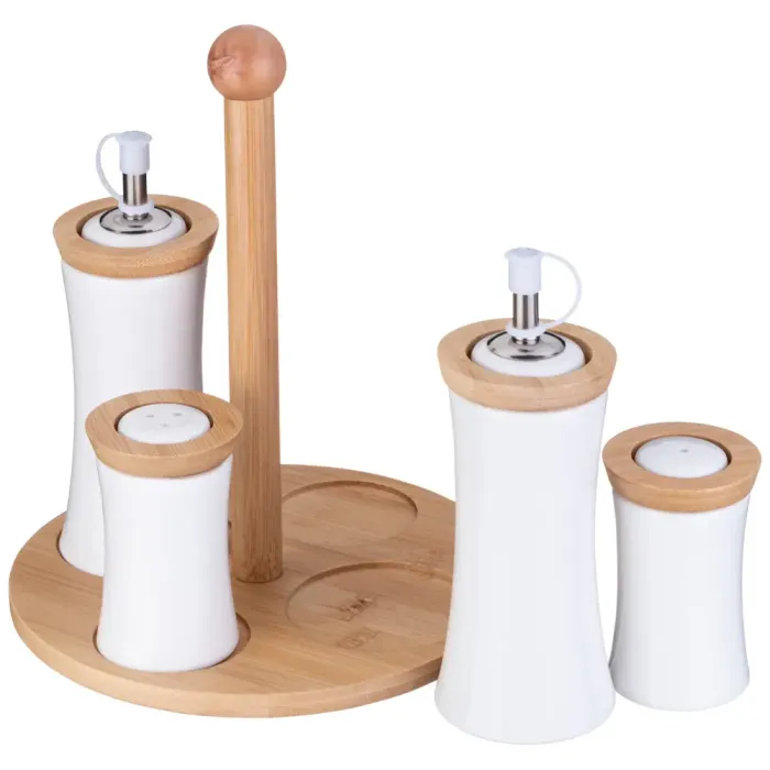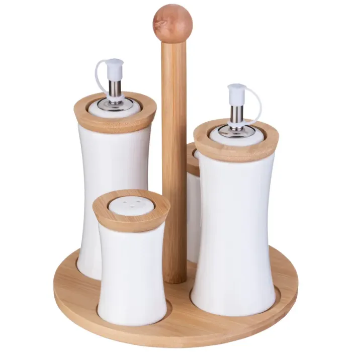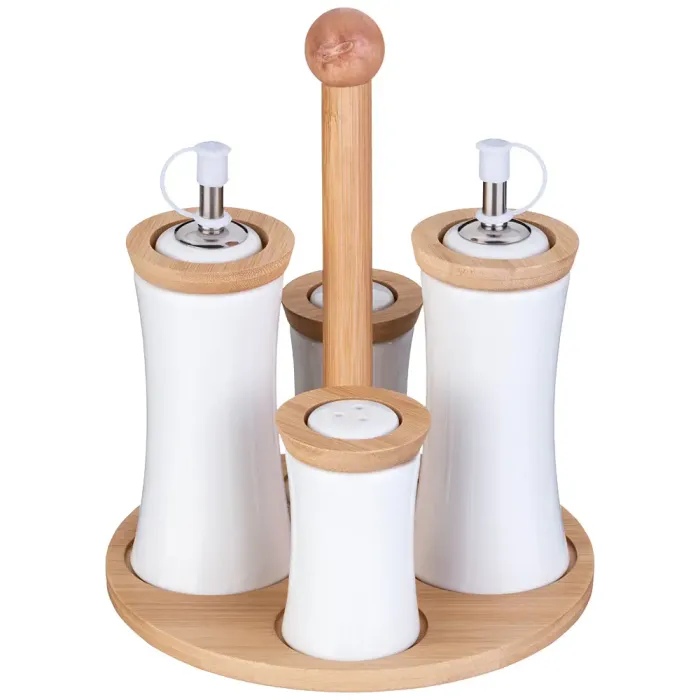 - Материал: белый фарфор Durable Porcelain, бамбук- Количество предметов в наборе: 4- Совместимость: фарфоровые предметы можно использовать в микроволновой печи и мыть в посудомоечной машине- Особенности ухода: бамбуковую подставку рекомендуется мыть вручную
