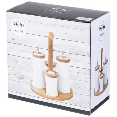 Набор для специй Native от бренда Lefard предназначен для хранения и подачи специй. В комплект входят четыре предмета: солонка, перечница, салфетница и деревянная подставка. Изделия выполнены из белого фарфора Durable Porcelain и бамбука.