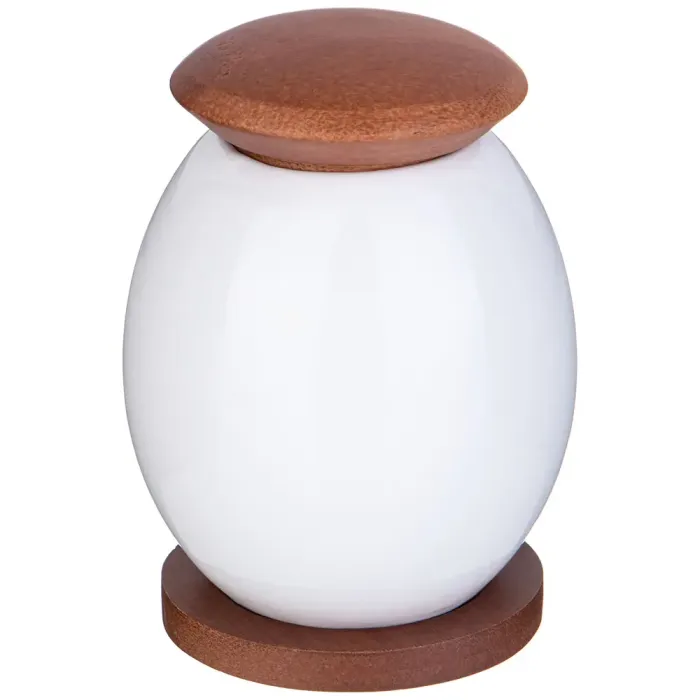 Корпус банки выполнен из фарфора Durable Porcelain, который отличается высокой износостойкостью и прочностью. Поверхность покрыта глазурью, обеспечивающей блеск и защиту от мелких повреждений. Бамбуковая крышка плотно прилегает, а деревянная подставка служит для устойчивости изделия на поверхности.