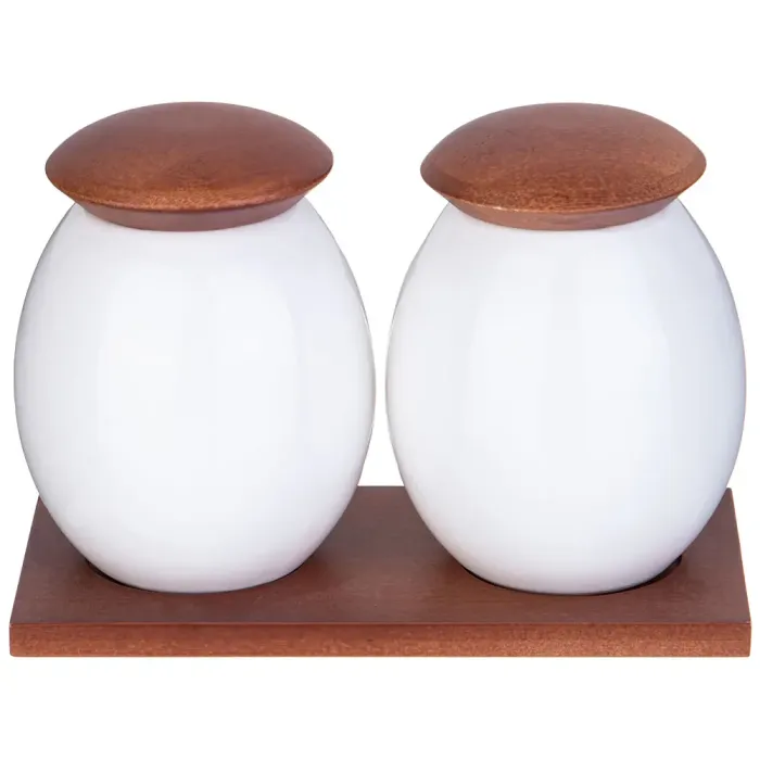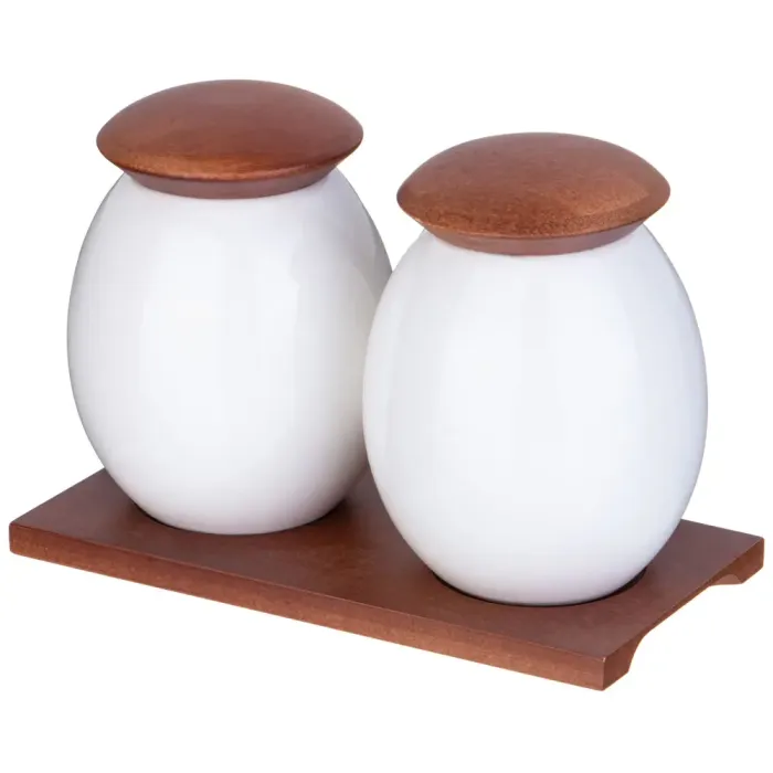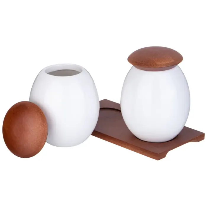 - Материал: фарфор Durable Porcelain, дерево, бамбук- Размеры банки: 18.5*12 см- Объём каждой банки: 400 мл- Количество в наборе: 2 банки на деревянной подставке- Совместимость: фарфоровые части — СВЧ, ПММ- Особенности ухода: деревянные элементы требуют ручной мойки без агрессивных средств
