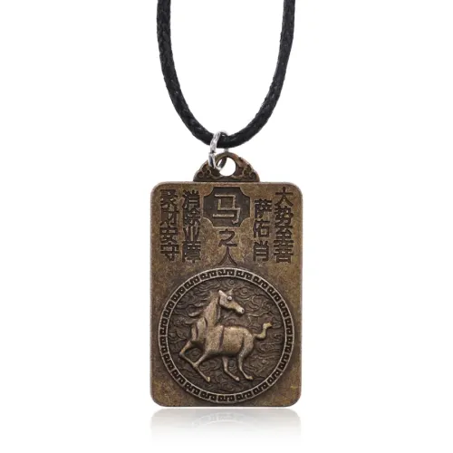 Амулет на шнурке, представляющий символ года Лошади по восточному гороскопу. Изготовлен из металла с покрытием под бронзу.