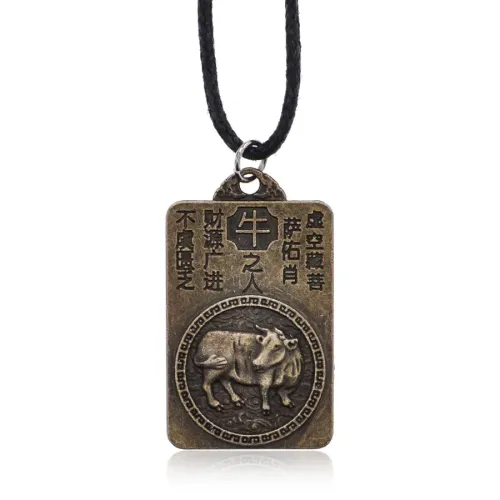 Амулет на шнурке, посвящённый году Быка по восточному гороскопу. Изготовлен из металла с покрытием под бронзу.