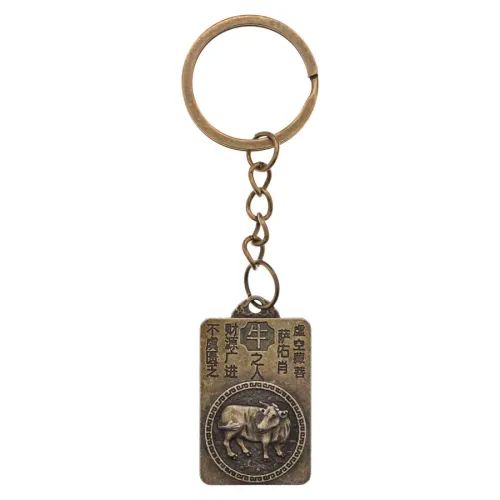 Брелок для ключей из металла с покрытием под бронзу в виде символа года Быка по восточному гороскопу.