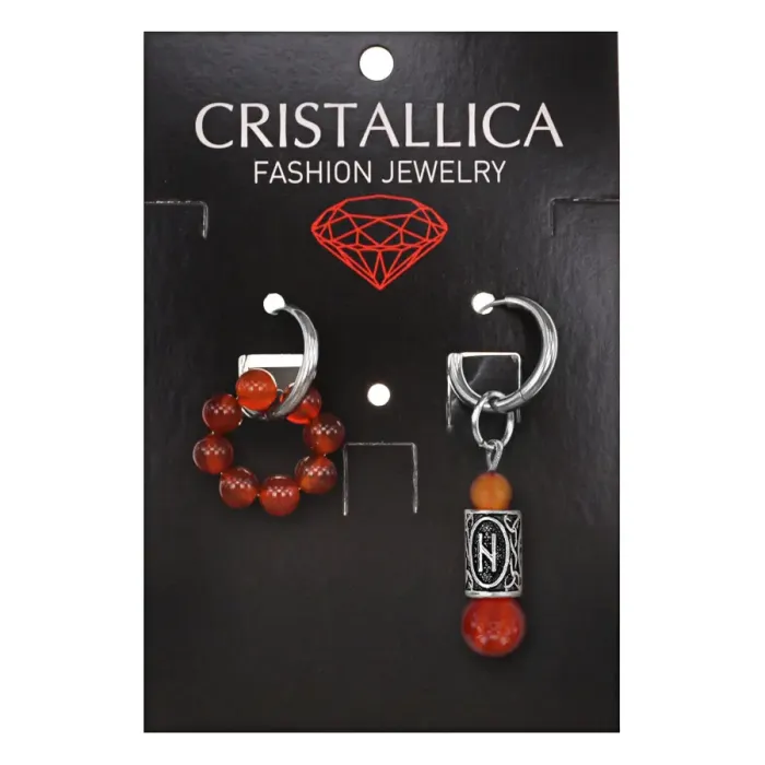 Серьги-амулеты асимметричного дизайна из гипоаллергенного сплава с натуральным сердоликом и символикой руны Хагалаз.