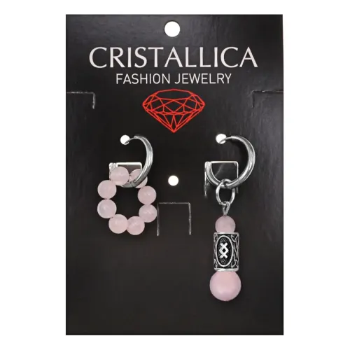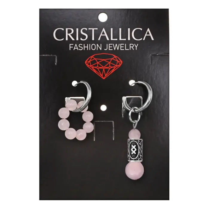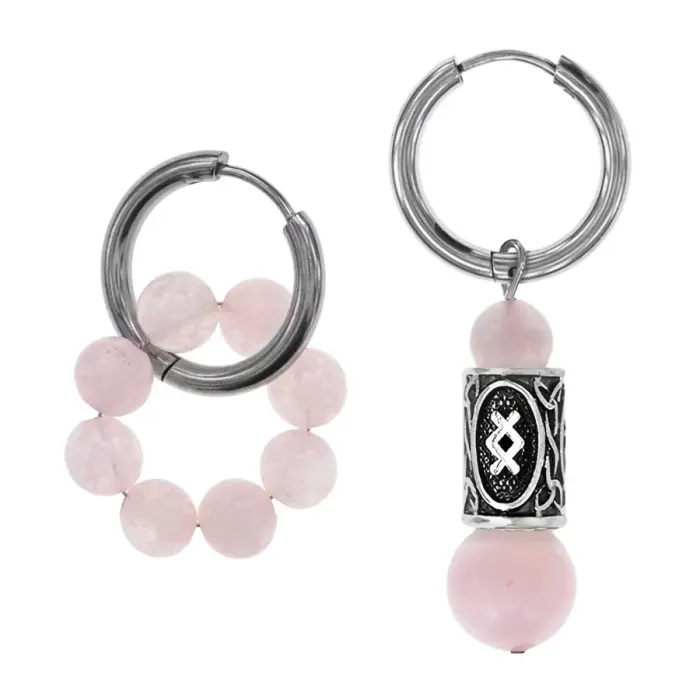 Серьги-амулеты асимметричной формы из гипоаллергенного сплава и натурального розового кварца с нанесённой руной Ингуз.