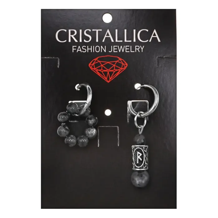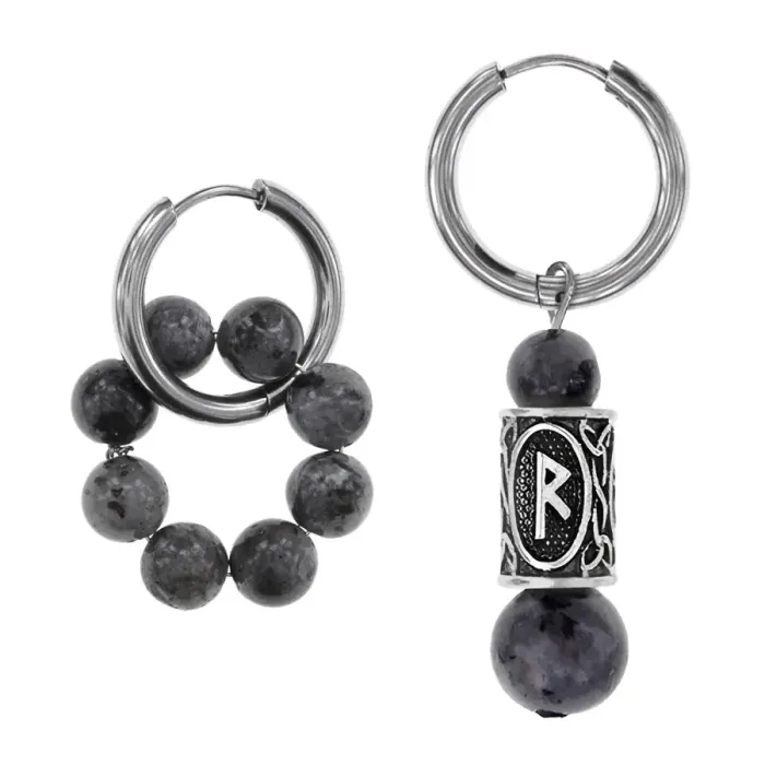 Асимметричные серьги-амулеты из гипоаллергенного сплава с натуральным камнем лабрадор и символом руны Райдо.