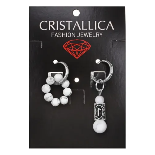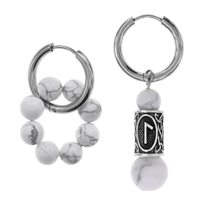 Серьги-амулеты асимметричного дизайна из гипоаллергенного сплава с натуральным камнем кахолонг и символикой руны Лагуз.