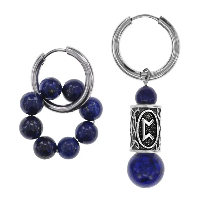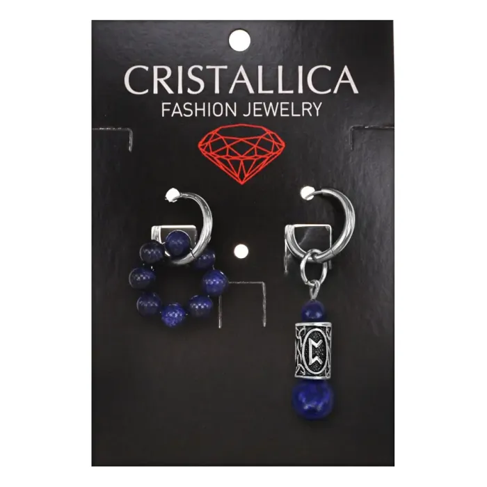 Серьги-амулеты асимметричного дизайна из гипоаллергенного сплава с натуральным камнем лазурит и символикой руны Перт.