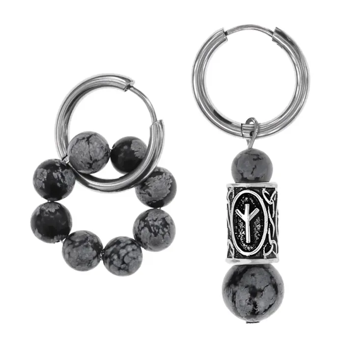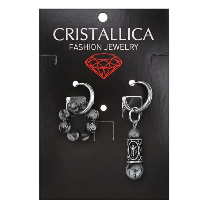 Серьги-амулеты асимметричного дизайна из гипоаллергенного сплава с натуральным камнем обсидиан и символом руны Альгиз.