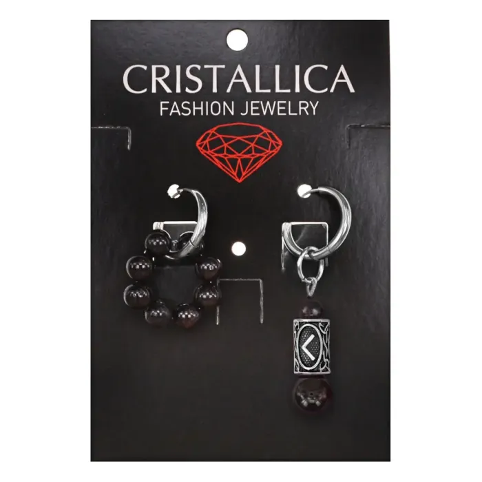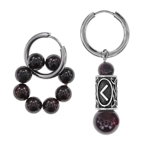 Асимметричные серьги-амулеты из коллекции Cristallica с руной Кеназ и натуральным гранатом.