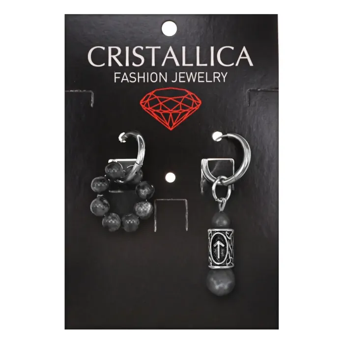 Асимметричные серьги-амулеты из коллекции Cristallica. Изготовлены вручную из гипоаллергенного сплава с натуральным камнем лабрадор и изображением руны Тейваз.