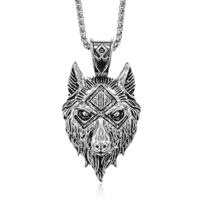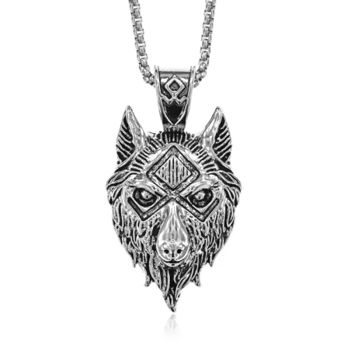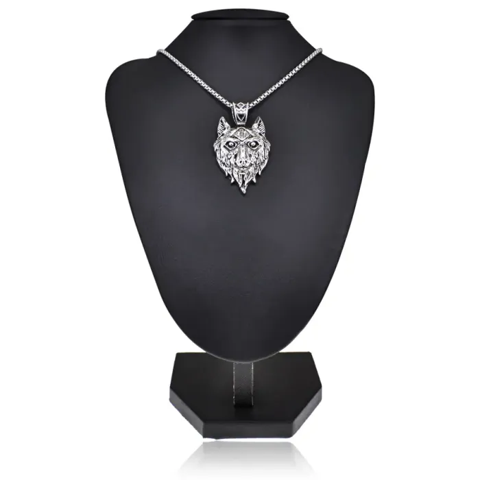 Металлический амулет в виде волка на цепочке.