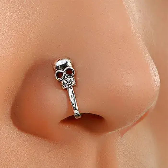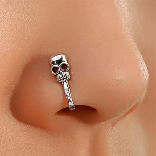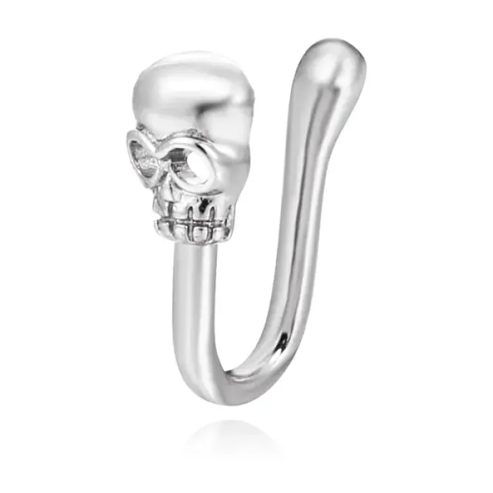 Серьга-кафф для носа в виде черепа из бижутерного сплава с серебряным покрытием.