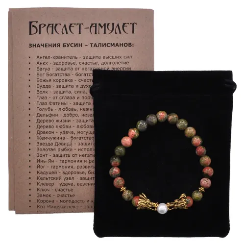 Браслет-амулет с подвеской в виде дракона и бусинами из натурального камня унакит.