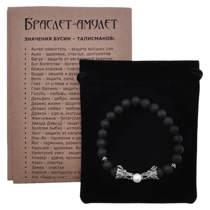 Браслет-амулет в виде стрейча с бусинами из бижутерного сплава и натурального камня лавы, украшенный символикой дракона.