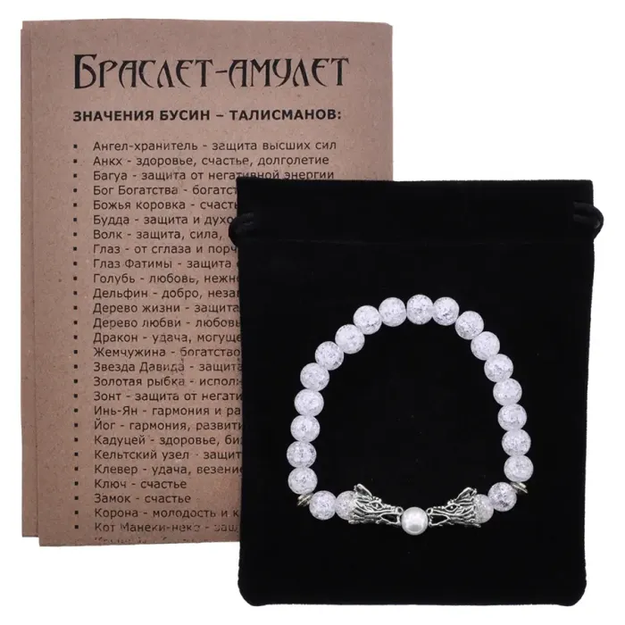 Браслет-амулет с изображением драконов и синтетическим камнем сахарный кварц.