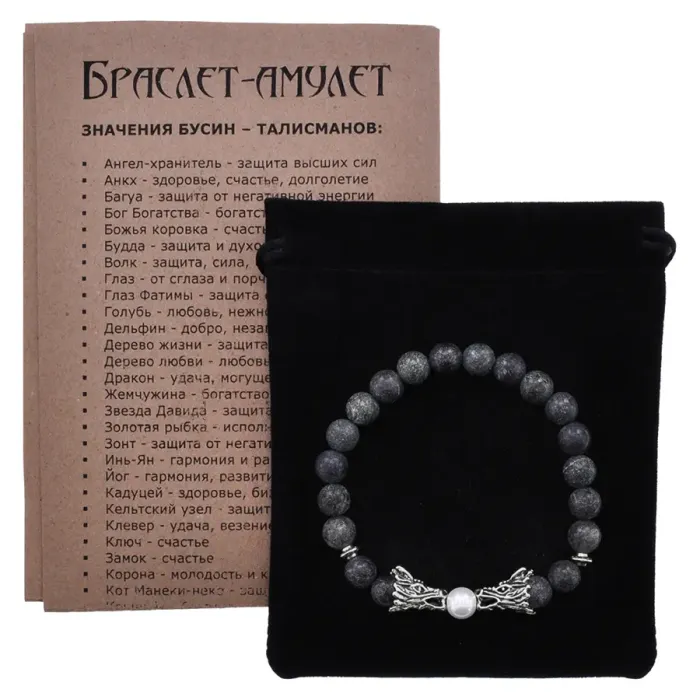 Браслет-амулет с бусинами из натурального змеевика и декоративными элементами в виде драконов.