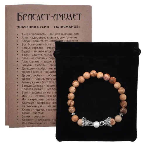 Браслет-амулет с бусинами из песочной яшмы и декоративными элементами с изображением дракона.