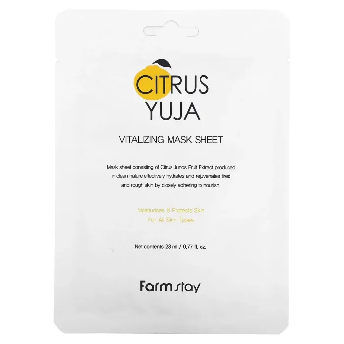 Освежающая тканевая маска FarmStay Citrus Yuja Vitalizing Mask Sheet — это эффективное средство для экспресс-ухода за кожей лица, шеи и декольте. Маска помогает поддерживать свежесть и сияние кожи, обеспечивая комфортное ощущение после применения. В основе формулы лежит экстракт юдзу, который оказывает мощное антиоксидантное действие. Он способствует разглаживанию морщин, стимулирует синтез коллагена и повышает упругость и эластичность кожи.