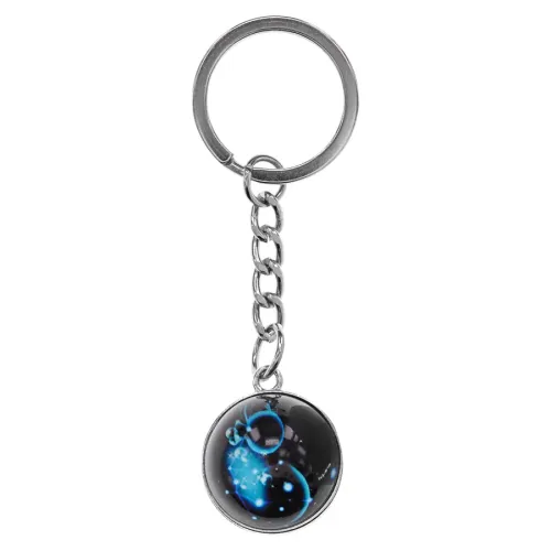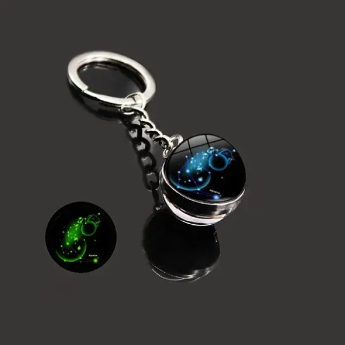 Брелок для ключей из металла и стекла со светящимся в темноте изображением знака зодиака.