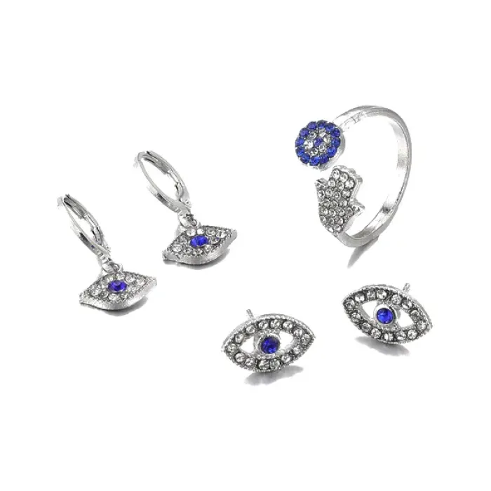Комплект бижутерии от сглаза, состоящий из кольца и двух пар серег, изготовлен из бижутерного сплава.