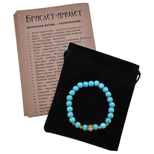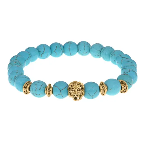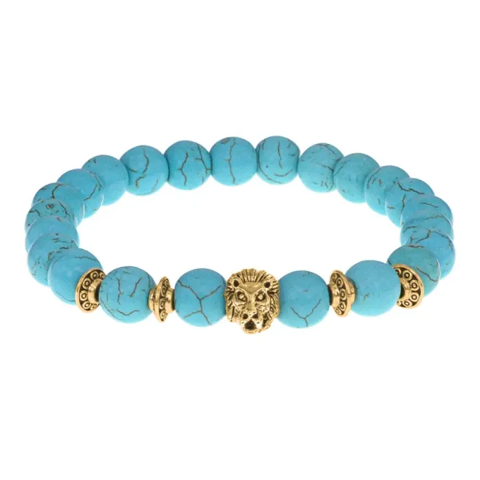 Стрейч-браслет с амулетом в виде льва и бусинами под бирюзу.