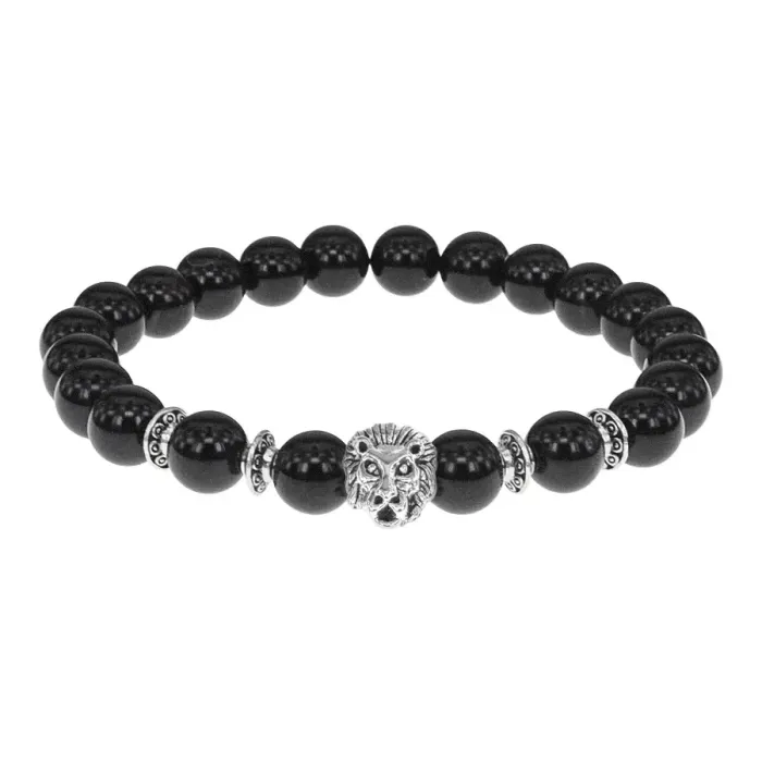 Браслет-амулет Лев с нат. камнем Черный агат 8мм BSH-09-23S