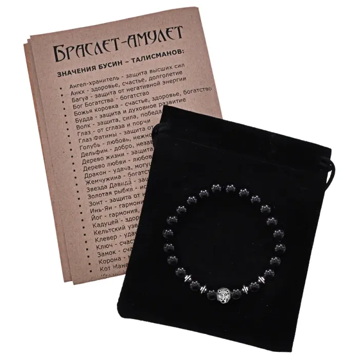 Браслет-амулет с подвеской в виде льва и бусинами из натурального чёрного агата.
