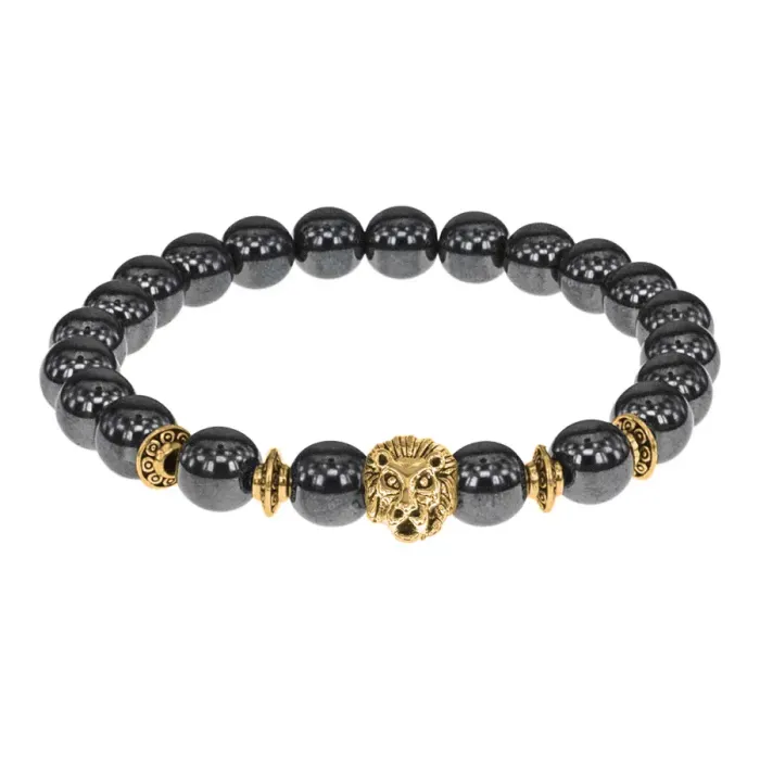 Браслет-амулет Лев с синт. камнем Гематит (не магнит.) 8мм BSH-09-28G
