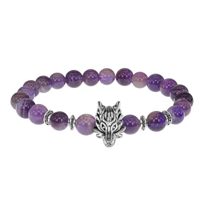 Браслет-амулет с подвеской в виде волка и натуральным камнем аметист. Стрейч-браслет с бусинами диаметром 8 мм.