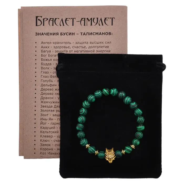 Браслет-амулет Волк с синт. камнем Малахит 8 мм BSH-10-12G