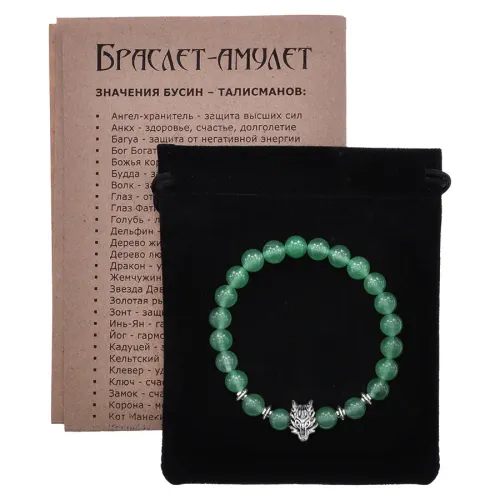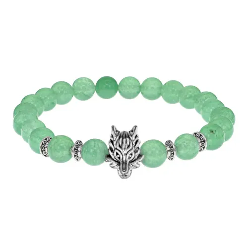 Стрейч-браслет-амулет с бусинами из натурального нефрита и декоративным элементом в виде волка.