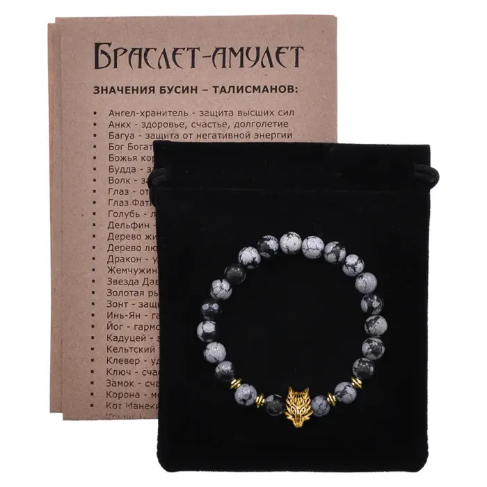 Браслет-амулет Волк с нат. камнем Снежный обсидиан 8мм BSH-10-14G