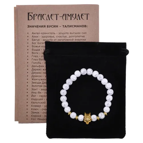 Стрейч-браслет с бусинами из синтетического камня и подвеской-амулетом в виде волка.