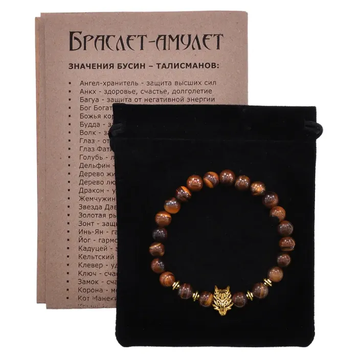 Браслет-амулет с подвеской в виде волка и бусинами из натурального камня тигровый глаз.