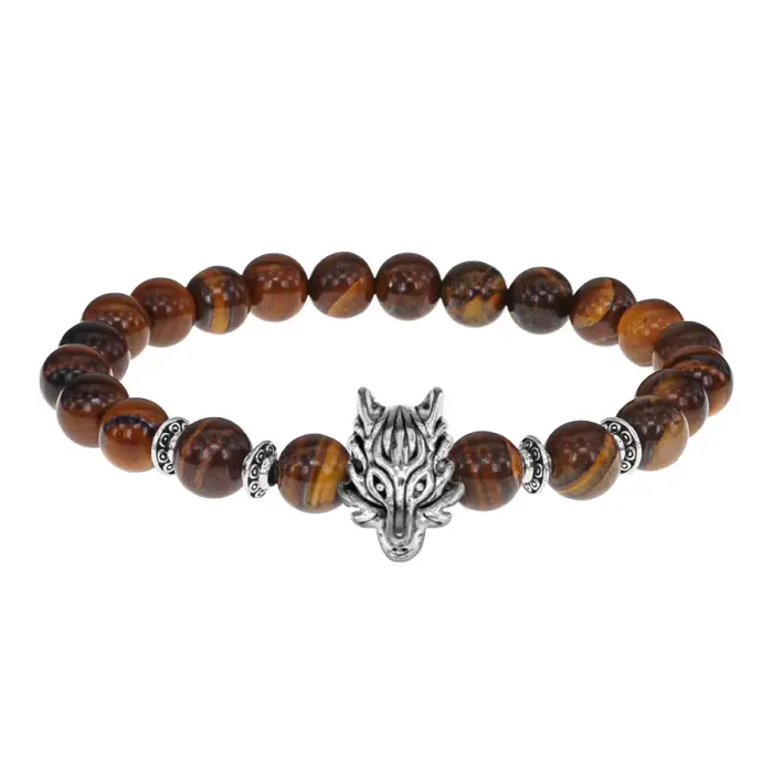 Браслет-амулет в стиле стрейч с бусинами из натурального камня и декоративными элементами в виде волка.