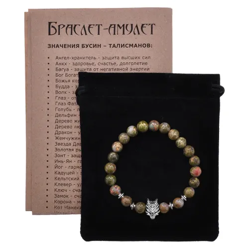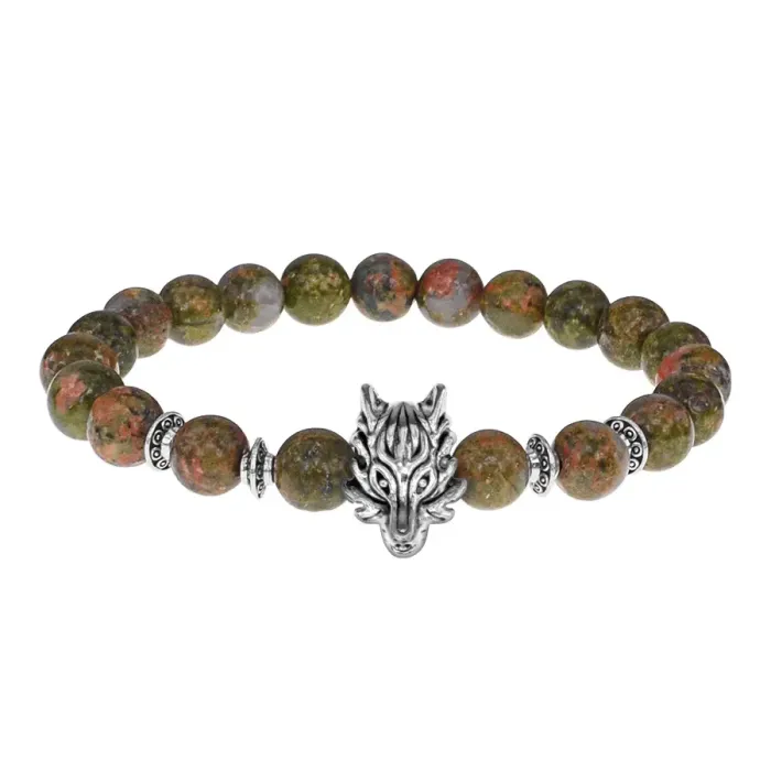 Браслет-амулет Волк с нат.камнем Унакит 8мм BSH-10-20S