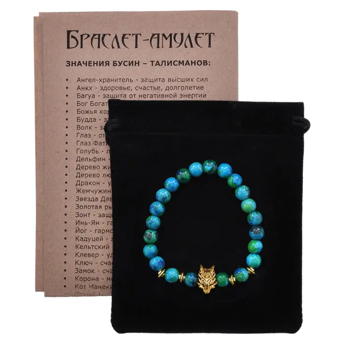 Браслет-амулет Волк с синт. камнем Хризоколла 8мм BSH-10-21G