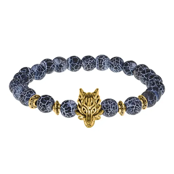 Браслет-амулет Волк с нат. камнем синий Африканский агат 8мм BSH-10-27G