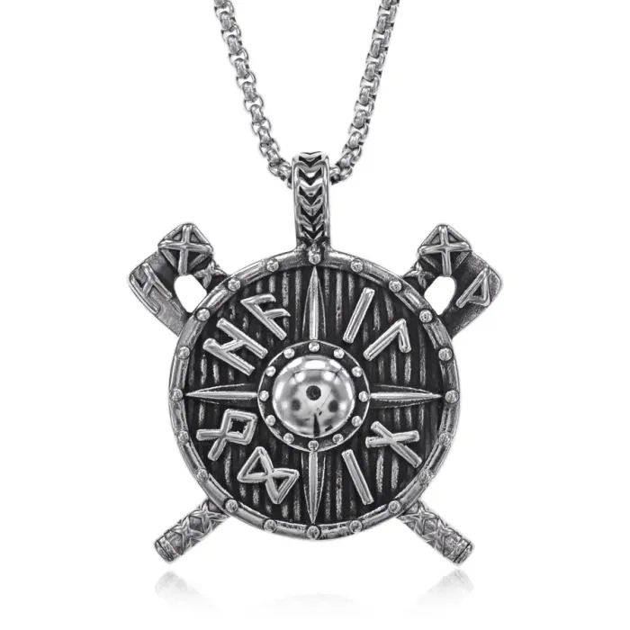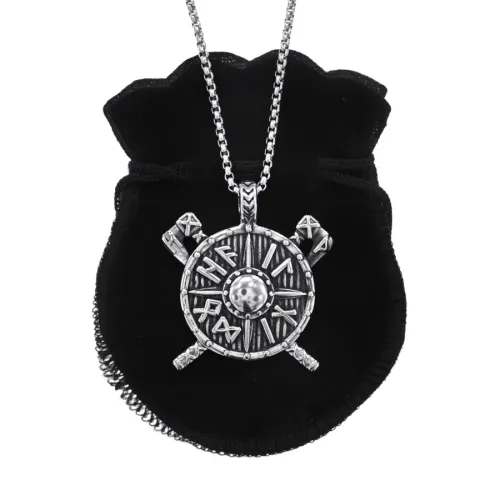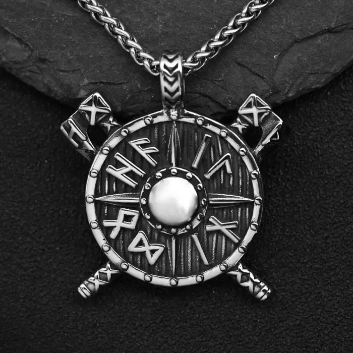 Сувенирный амулет в виде щита с рунами из нержавеющей стали на цепочке.