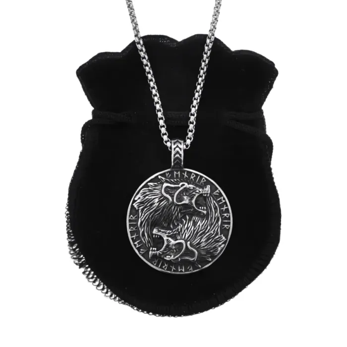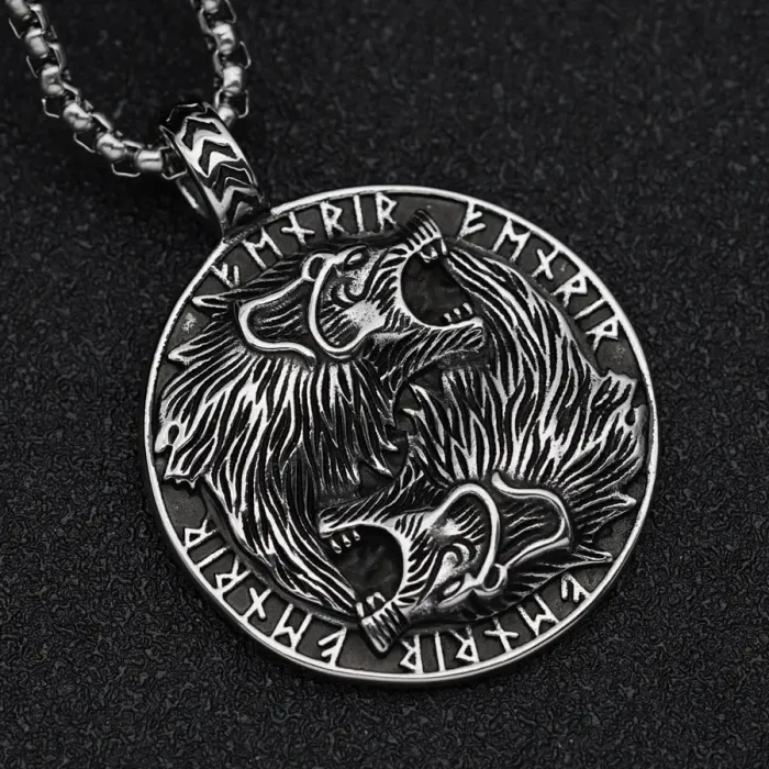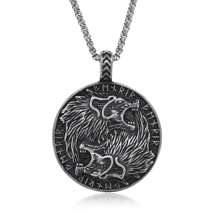 Амулет с изображением волков Гери и Фреки из скандинавской мифологии. Изготовлен из нержавеющей стали, оснащён цепочкой и замком типа лобстер.
