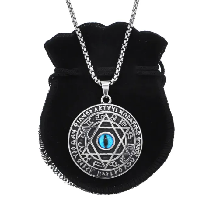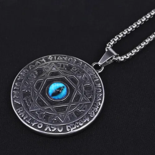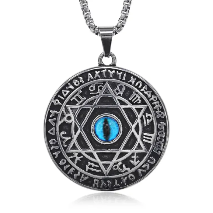 Амулет с символами Глаза и Звезды Давида из нержавеющей стали со стеклянной вставкой на цепочке.