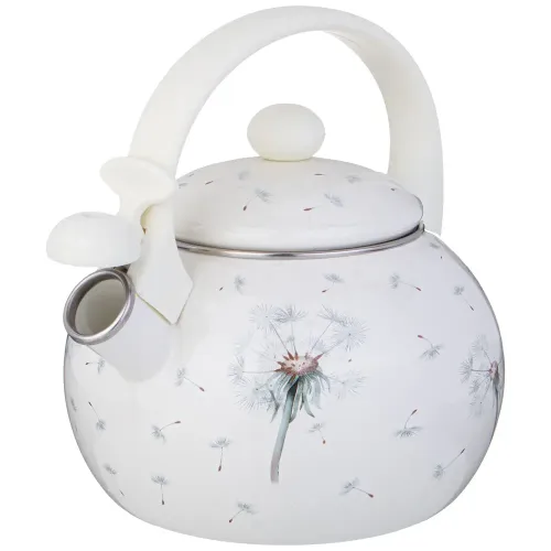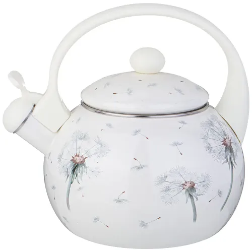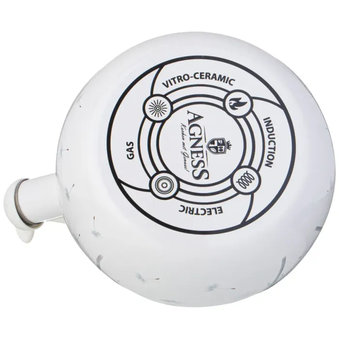 Эмалированный чайник со свистком серии Dandelion от Agness предназначен для кипячения воды на всех типах плит. Ключевыми особенностями являются материал — эмалированная сталь, и наличие свистка, сигнализирующего о закипании.