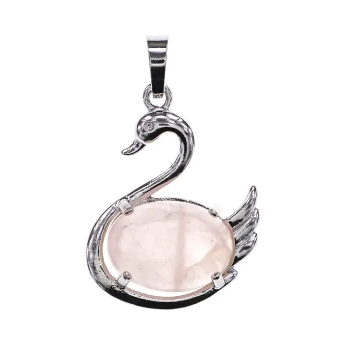 Кулон в виде лебедя из натурального розового кварца и бижутерного сплава с серебряным покрытием.