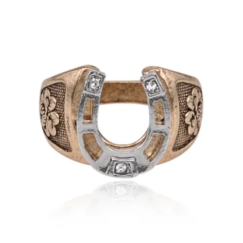 Кольцо с дизайном в виде клевера и подковы. Изготовлено из металла с покрытием под золото и серебро.