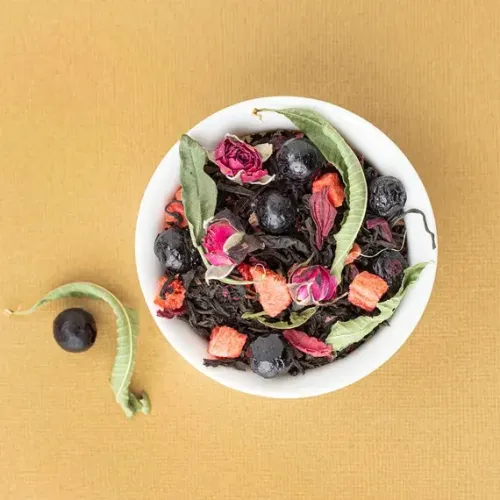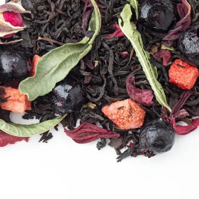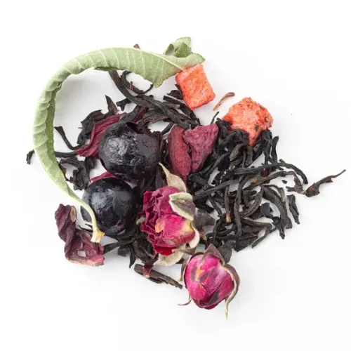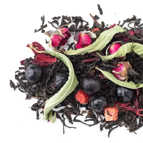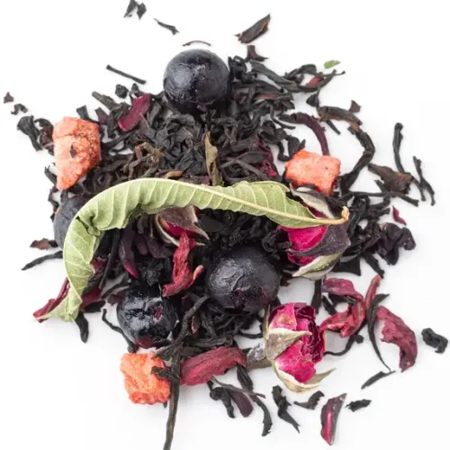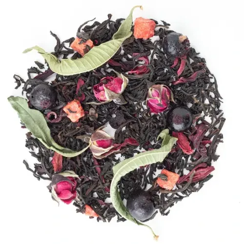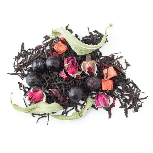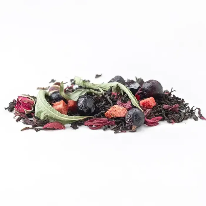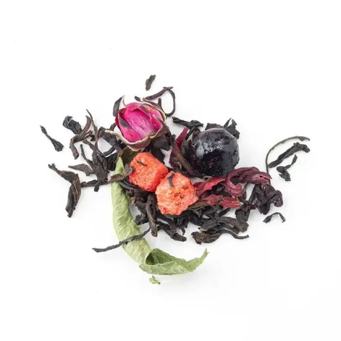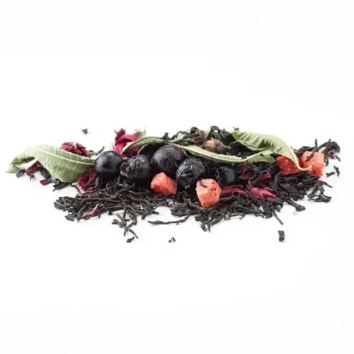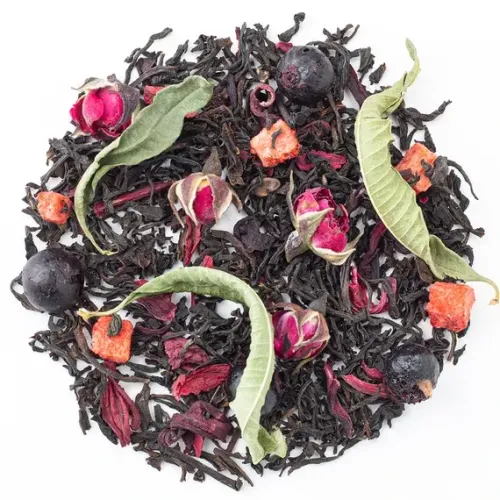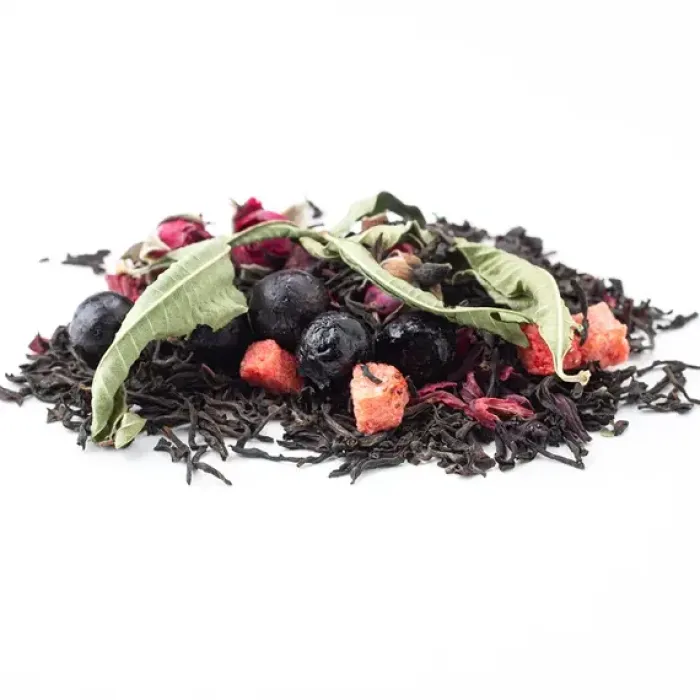 Ароматизированный чёрный чай с ярким фруктово-ягодным характером. Насыщенный настой индийского листа гармонично дополнен нотами спелой клубники, чёрной смородины и лёгкой свежестью аромата ягодного сорбета, с цветочными акцентами розы и вербены.