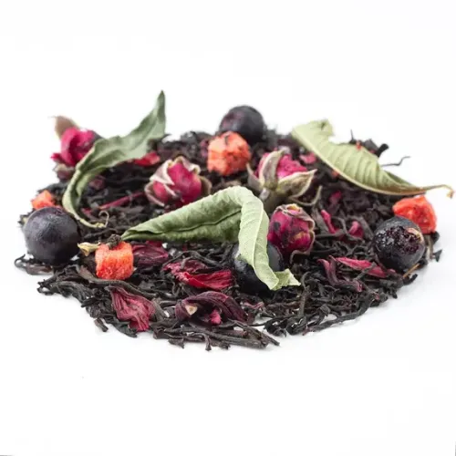 Состав: чёрный индийский чай, каркаде, чёрная смородина (ягоды), бутоны розы, кусочки клубники, листья вербены, аромат ягодного сорбета.